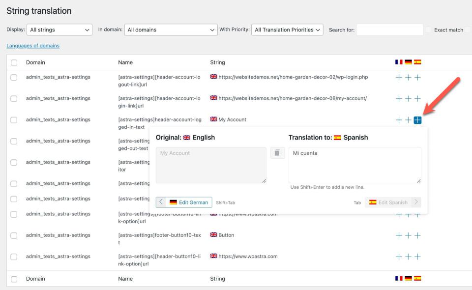 - ترجمه دستی: برای ترجمه دستی رشته ها، به سادگی روی علامت “+” در کنار زبان مورد نظر کلیک کنید و ترجمه خود را وارد کنید.