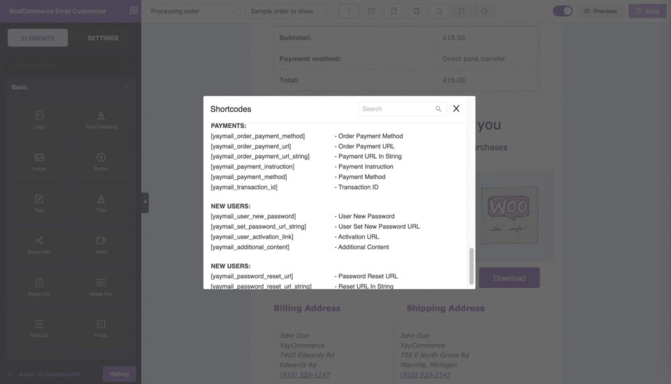 YayMail Pro کنترل کاملی بر ظاهر و محتوای ایمیل های ووکامرس شما به شما می دهد. رابط کاربری بصری کشیدن و رها کردن به شما امکان می دهد به راحتی الگوهای ایمیل را ویرایش کنید، عناصر را اضافه یا حذف کنید، و سبک بندی را مطابق با میل خود تغییر دهید. می توانید تصاویر، دکمه های فراخوان به عمل (CTA)، و متن دلخواه را اضافه کنید تا پیامی کاملاً واضح و جذاب برای مشتریان خود ارسال کنید.