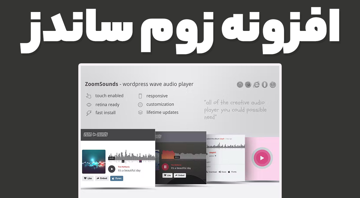 آیا می خواهید یک پخش کننده صوتی html5 قوی، پیشرفته، آماده شبکیه چشم و پاسخگو برای سایت خود داشته باشید؟ افزونه زوم ساندز کاندیدای عالی است. ZoomSounds با 9 پوسته متناسب با هر برند، طرحبندی چندگانه برای پوسته موجی، تنها یک فرمت برای عملکرد مورد نیاز است، ZoomSounds بهترین انتخاب برای پخشکننده صوتی است.